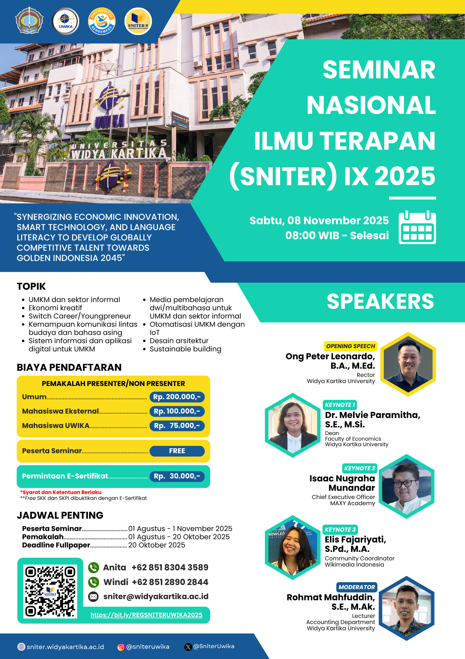 SNITER VIII 2024 menampilkan empat pembicara utama, yaitu: Prof. Dr. Saiful Bukhori, S.T., M.Kom. (Pakar Artificial Intelligence (Universitas Negeri Jember), Prof. Dr. Ir. Joko Lianto Buliali, M.Sc. (Pakar Computer Science ITS Surabaya), dan Ass. Prof. Dr. Eka Fadillah, S.S., M.Pd. (Pakar Linguistik, Universitas Widya Kartika). Setiap pembicara membawa topik yang relevan dengan tema utama, seperti pemanfaatan AI untuk mengenal perilaku konsumen, pengaruh AI dalam bidang kehidupan, serta dampak perkembangan teknologi terhadap kemampuan literasi bangsa Indonesia.